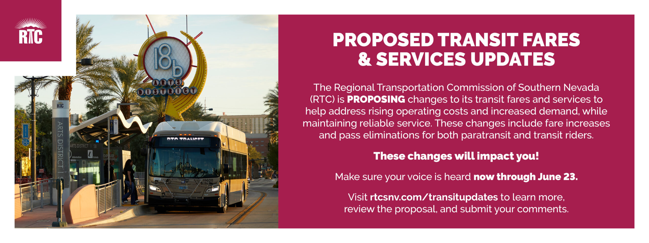The Regional Transportation Commission of Southern Nevada (RTC) is PROPOSING changes to its transit fares and services to help address rising operating costs and increased demand, while maintaining reliable service. These changes include fare increases and pass eliminations for both paratransit and transit riders, as well as route and timing changes for transit service.
